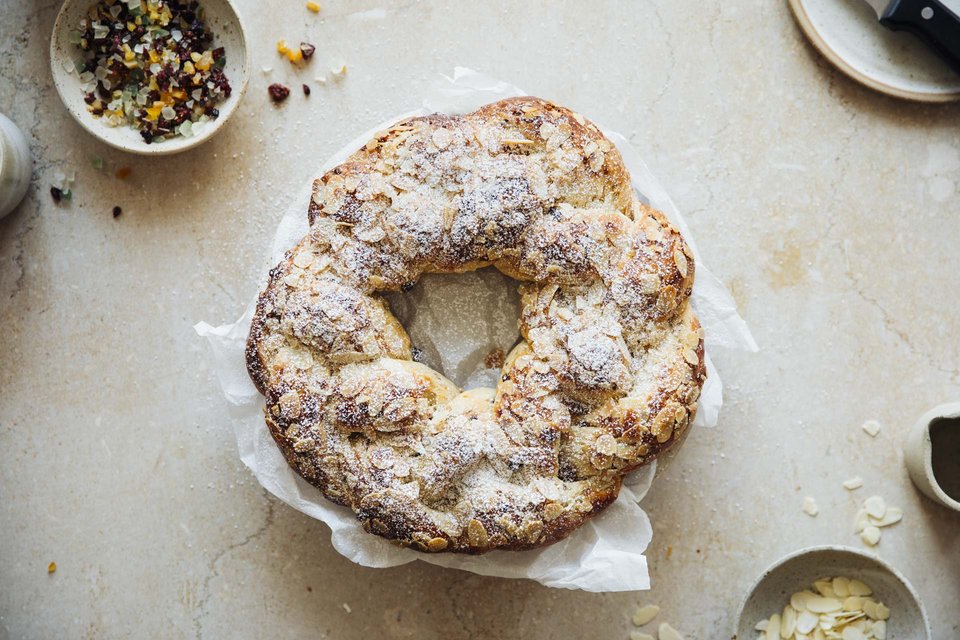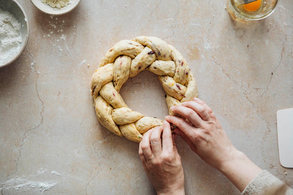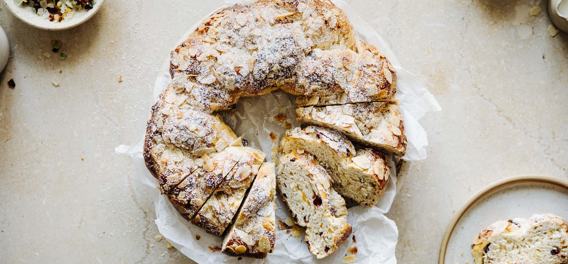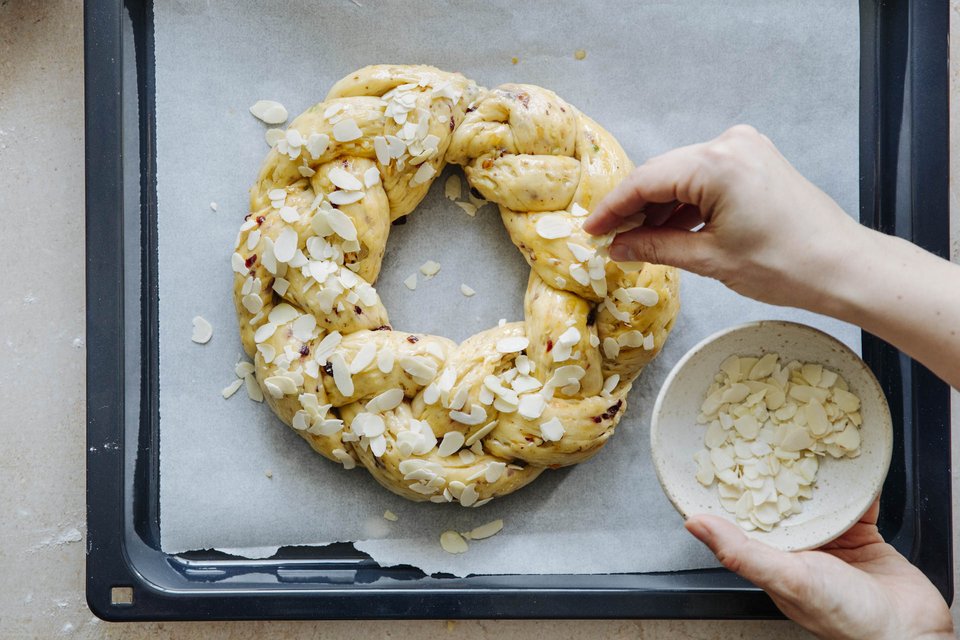 Den Kranz auf ein mit Backpapier ausgelegtes Backblech legen und ca. 45 Minuten gären lassen. Nach dem Gären die Oberfläche mit Ei bestreichen und nach Belieben gehobelte weisse Mandeln aufstreuen.