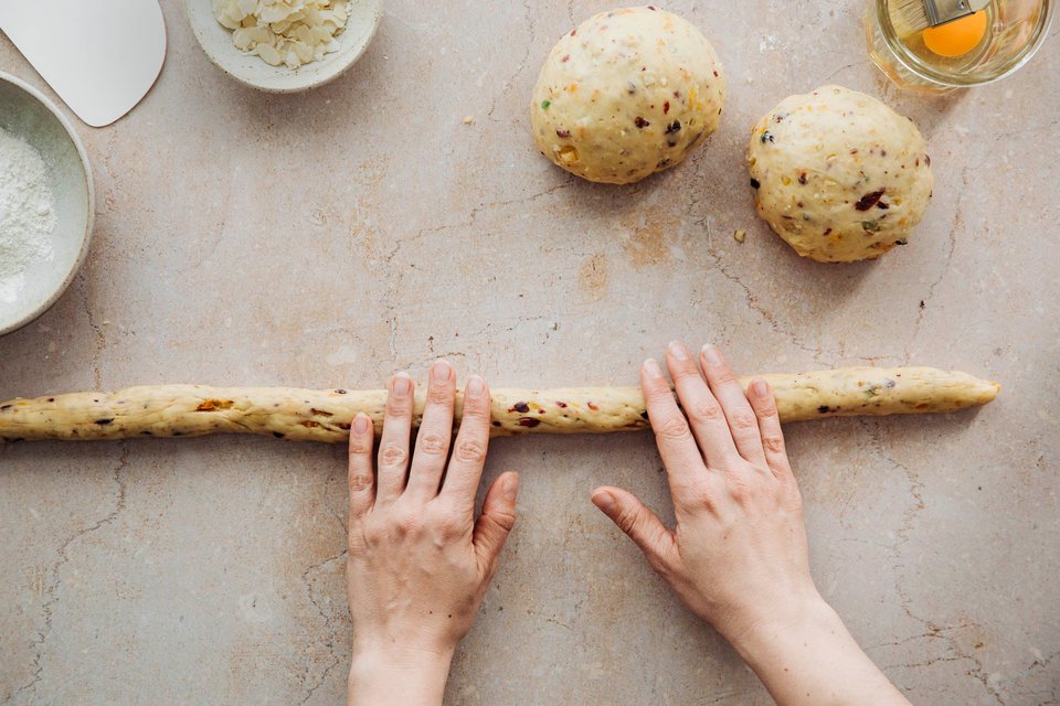 Nach der Ruhezeit den Teig in drei gleichgrosse Teile portionieren und diese leicht rund formen. Nach einer kurzen Liegezeit von gut 10 Minuten die einzelnen Stücke auf eine Länge von ca. 50 cm gleichmässig ausrollen.