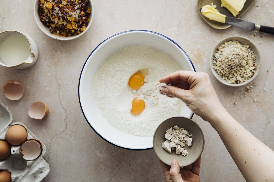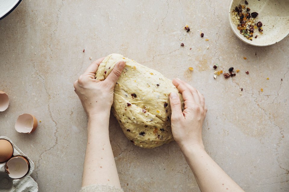 Nun die restlichen Zutaten (Mandeln, Haselnüsse und kandierte Früchte) unter den Teig ziehen und diesen ca. 60 Minuten zugedeckt bei Raumtemperatur stehen lassen.