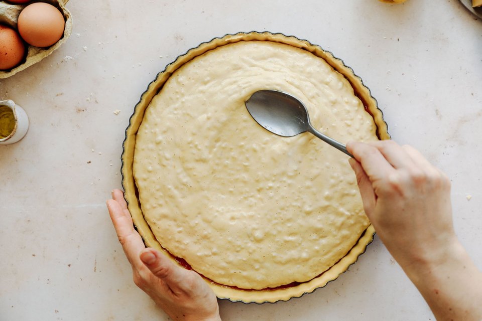 Anschliessend die fertige Füllung gleichmässig auf dem Teig verteilen und verstreichen.