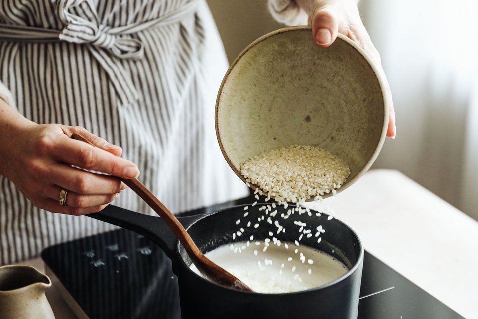 Butter, Vollmilch, Zucker, Salz und Vanillezucker in eine Pfanne geben und aufkochen. Anschliessend den Reis dazugeben. Die Hitze auf mittlere Stufe zurückdrehen und den Reis garkochen.