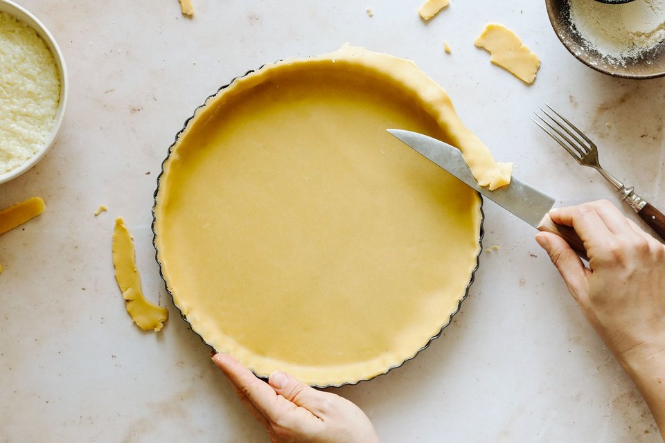 Den Teig auf 3.5 mm ausrollen und in die gefettete Form (ca. 28 cm Ø) legen.