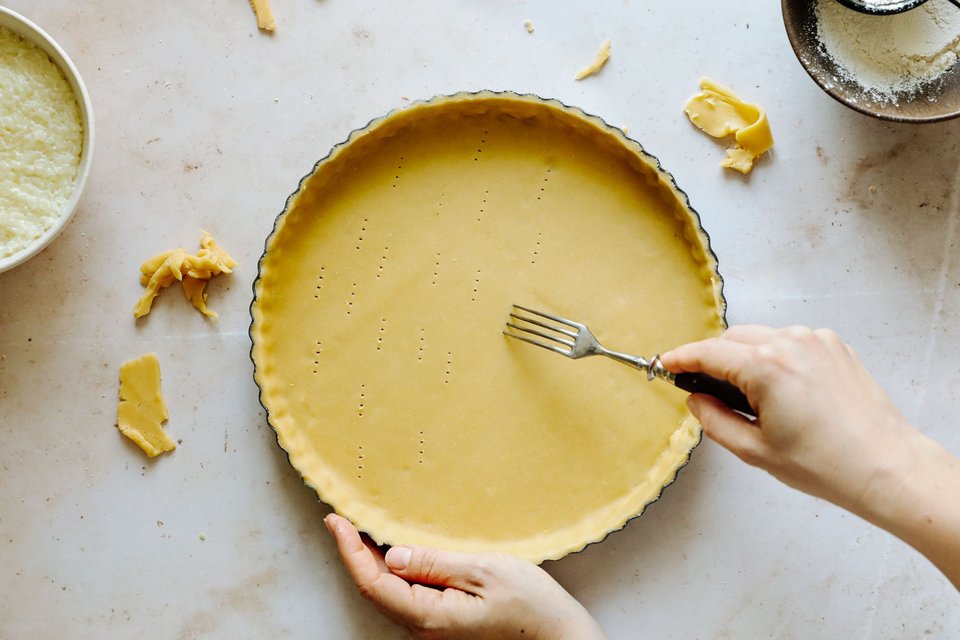 Mit einer Gabel gleichmässig Löcher in den Teig einstechen.