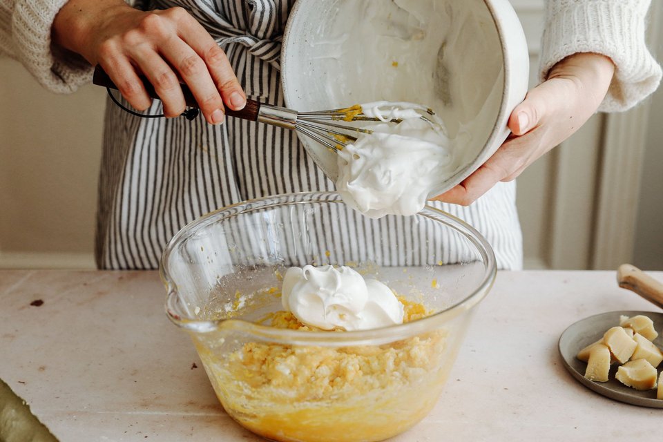 Anschliessend die Reismasse, Weissmehl und flüssige Butter unter die Marzipan-Eigelbmischung ziehen. Eiweiss mit dem Zucker steif schlagen und vorsichtig und gleichmässig unter die Masse heben.