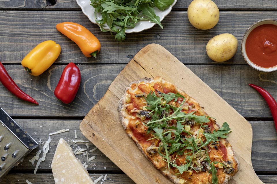 Den tiefgekühlten Pinsa-Boden leicht antauen lassen und mit einer feinen Tomatensauce bestreichen. Feingeschnittene Anchovis gleichmässig darauf verteilen. Paprikaschoten und dünn geschnittene Kartoffelstreifen auflegen und gut würzen. Die Pinsa anschliessend mit Grana Padano bestreuen und für 8 Minuten bei 220° C backen. Vor dem Servieren mit Rucola garnieren. En Guete!