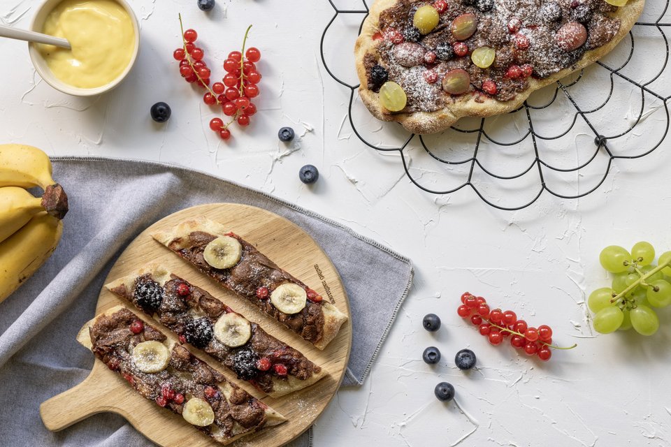 Den tiefgekühlten Pinsa-Boden leicht antauen lassen und anschliessend gleichmässig mit Kristallzucker bestreuen. Danach während ca. 3 Minuten bei 200°C Ober- und Unterhitze backen. Den leicht ausgekühlten Boden je nach Lust und Laune mit Haselnusscreme, Vanille- oder Joghurtcreme bestreichen und mit frischen Früchten ausgarnieren. Ob Beeren, Trauben, Ananas, Bananenscheiben oder Kompott-Birnen – der Fantasie sind keine Grenzen gesetzt.