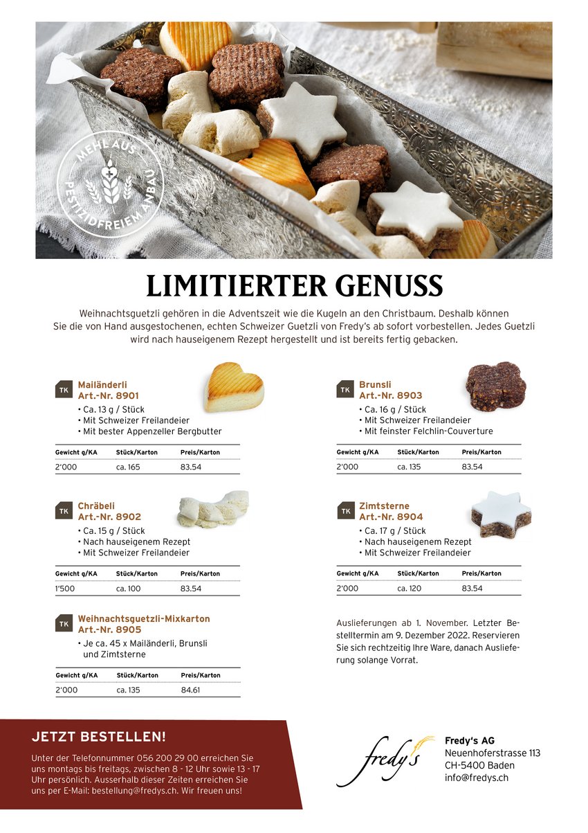 Versüssen Sie sich die Adventszeit mit unseren feinen Weihnachtsguetzli. Jetzt vorbestellen und ab 1. November 2022 geniessen!