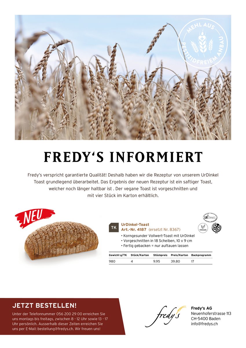 Fredy's steht für garantierte Qualität. Deshalb wurde die Rezeptur unseres UrDinkeltoasts überarbeitet und heraus kam ein völlig neuer, noch saftigerer Toast. Der korngesunde, vegane Toast ist bereits vorgeschnitten erhältlich.