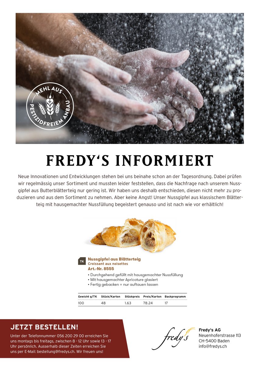 Leider mussten wir feststellen, dass die Nachfrage nach unserem Nussgipfel aus Butterblätterteig nur gering ist. Wir haben uns deshalb entschieden, diesen nicht mehr zu produzieren und aus dem Sortiment zu nehmen.
